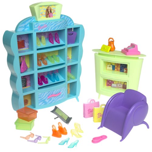 This is a fun and inexpensive playset complete with shoe measurer, cash register, Barbie-size chair, shoe boxes and display cases. The great thing is that it comes with extra purses and shoes that Barbie really can use. One flaw is common in the Barbie playsets: there is a "drawer" in the display cabinet that is fake. How nice if it actually would open to provide a little more storage. As with shoes, a girl never can have too much storage! BTW, you can seat Tangerine Twist (great orange lace-tie heels) in the purple chair, and pose the Ken Movie Date doll (redressed with a shirt and tie) as the shoe salesman because he can actually hold the shoeboxes.